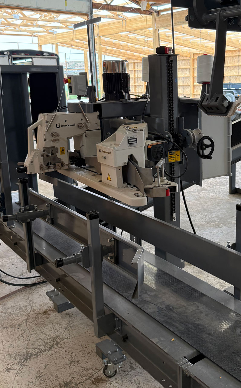 - Union Special Bag Sewing Machine – Includes industrial sewing pedestal, sewing head with guillotine style thread cutter, powered bag infeed, motor, and controls