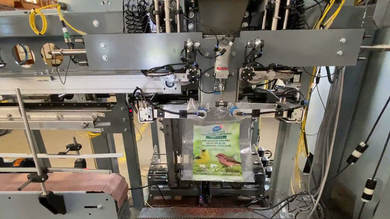 For open mouth bags or larger pouches, an empty bag is retrieved from a stack of bags by a robotic arm and placed or conveyed onto a staging tray. Then, the automatic bag placer’s arm swings down and picks up the bag and places it on the bag filling machine’s spout. After filling, a transfer arm moves the filled bag into a bag sewing or sealing system.